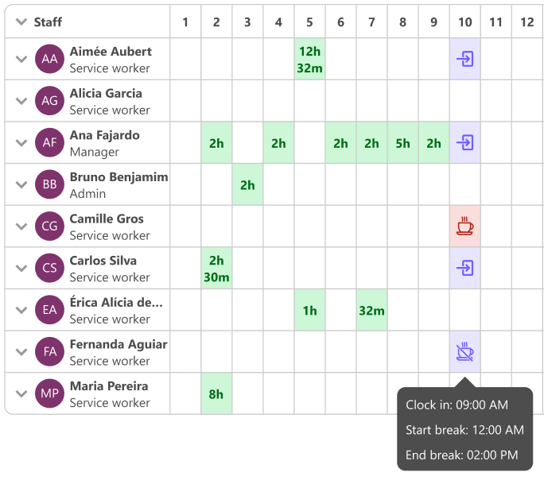 Agora pode ver todos os turnos da equipa, incluindo entradas, saídas e início/fim das pausas, diretamente na secção Funcionários / Folhas de horas.