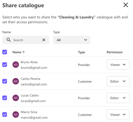 Agora pode selecionar todos os clientes ou todos os fornecedores na lista do catálogo de partilha de uma só vez, sem ter de os escolher um a um.