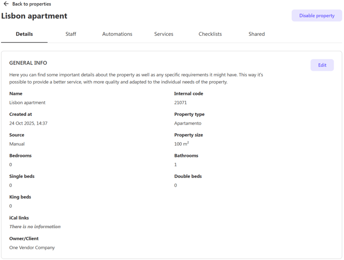 Os separadores “Informação da propriedade” e “Definições” foram combinados num único separador denominado “Detalhes”.